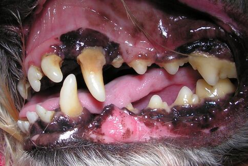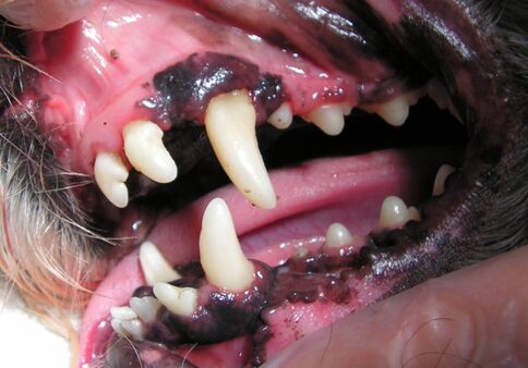 Sowohl für Hunde als auch für Katzen ist die Zahngesundheit sehr wichtig. Ähnlich wie beim Menschen kommt es bei Tieren auch zu Plaque- und anschließender Zahnsteinbildung. In der Folge sieht man oft das Bild eines hochgradig entzündeten Gebisses. Die Zähne sind stark von Zahnstein bedeckt, was zu Zahnwurzelvereiterungen und auch zu Organschäden (z.B. am Herzen oder den Nieren) durch sich ausbreitende bakterielle Infektionen führen kann. Davon abgesehen haben die Tiere natürlich auch Zahnschmerzen!